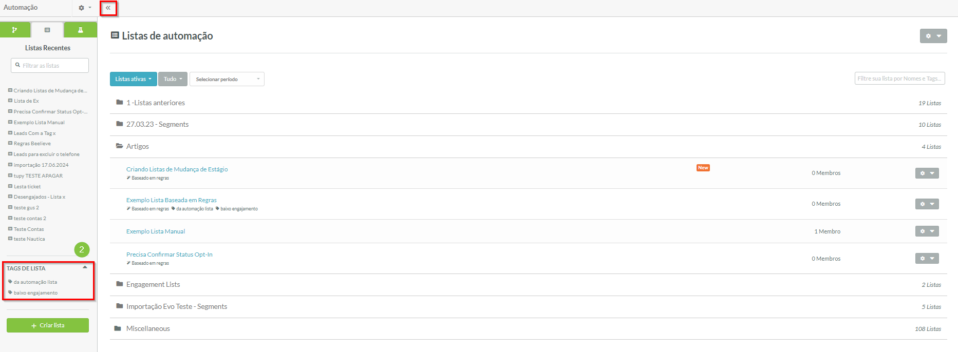Você pode criar tags de lista a partir da página principal de listas.