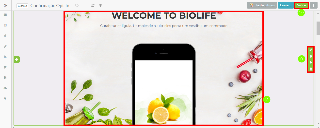 - Utilize os recursos no painel de designer de e-mail para modificar o e-mail.