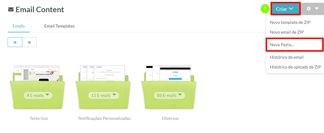 As pastas de email estão localizadas no topo de todos os emails disponíveis.