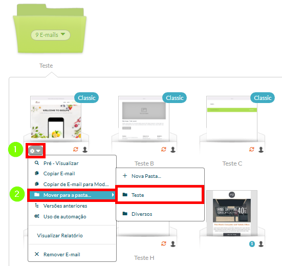 Opções. - Clique em Mover para pasta e selecione a pasta de destino.