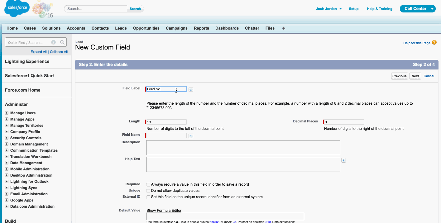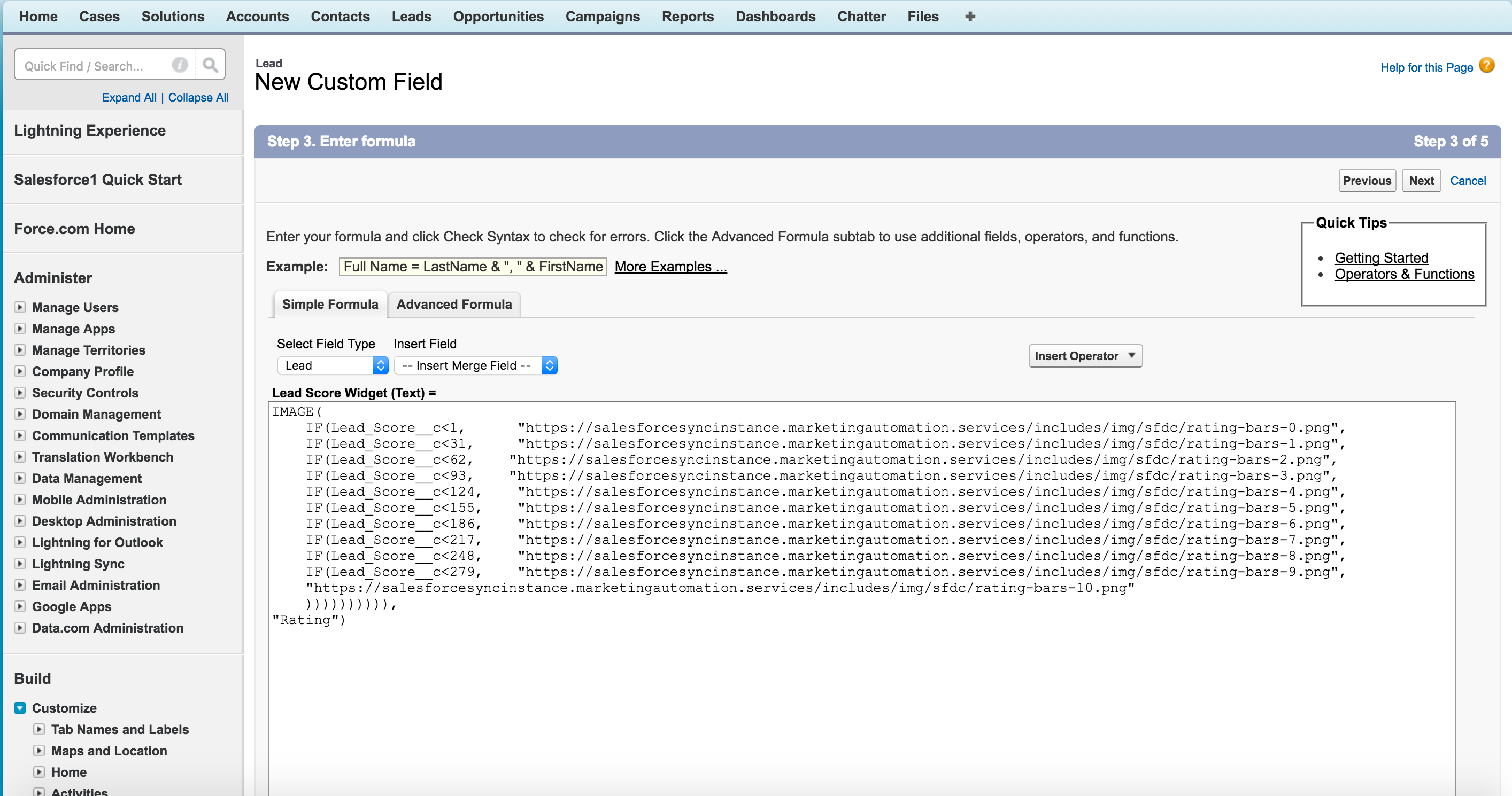 Dois campos personalizados devem ser criados dentro do Salesforce. O primeiro conterá o valor numérico da pontuação de leads mapeado do Lead Gen & CRM.