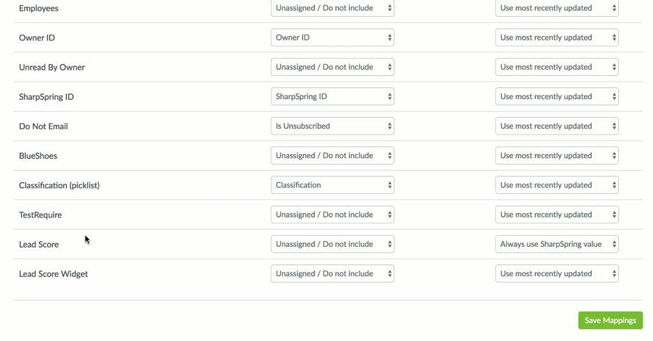 Nota: Na guia Mapeamentos de Leads, a coluna da esquerda puxa todos os campos CRM mapeáveis. A coluna do meio mostra o campo do Lead Gen & CRM que o campo do Salesforce será atribuído. A coluna da direita trata de como os dados serão atualizados.