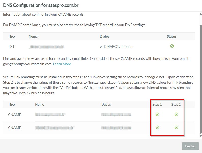 Se o card de DNS mostrar as marcas de verificação como acima, sua conta está configurada para enviar e-mails com links de rastreamento seguros (https://) que são rebatizados para combinar com seu domínio (link.seudominio.com).