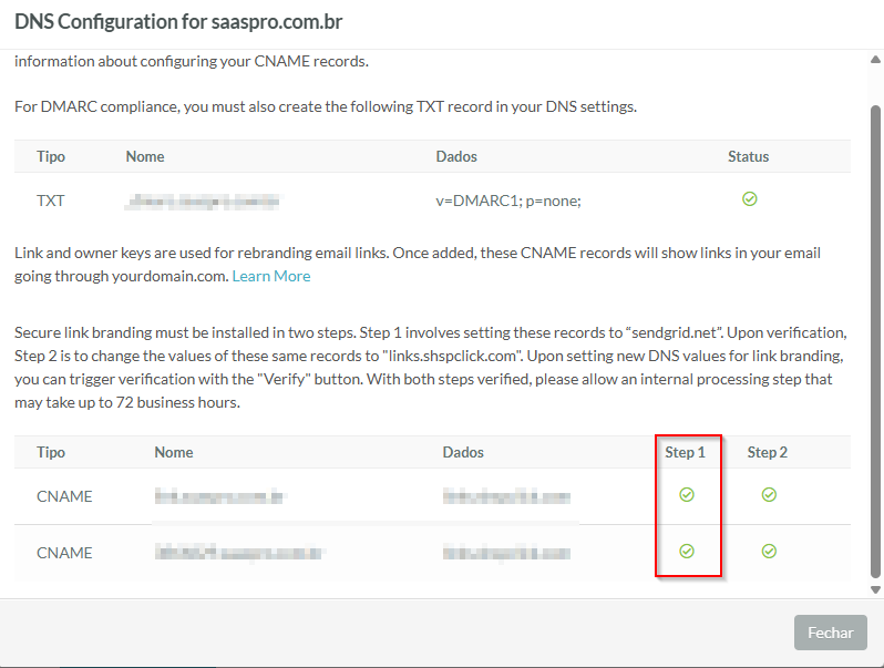 É isso! Assim que estiver totalmente verificado, o modal de Configurar DNS deve parecer assim: