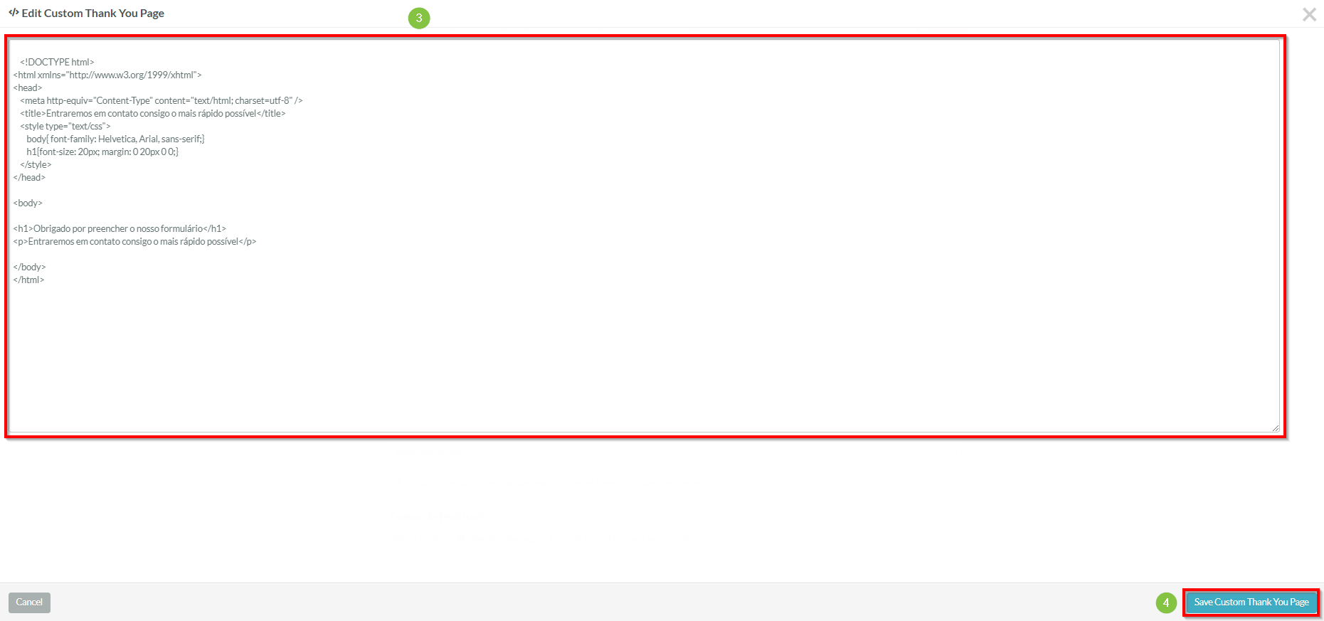 - Edite o HTML da página de agradecimento na janela que aparece.