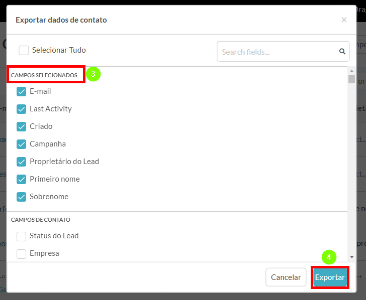 Nota: A seleção de campos inclui todos os campos do sistema e aqueles campos personalizados que estão disponíveis no Gerenciador de Contatos.