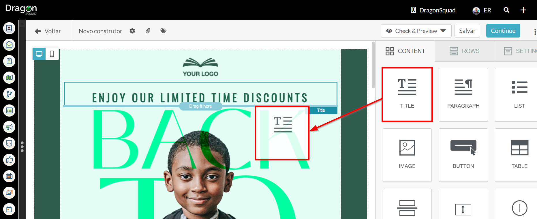 Para inserir um elemento de texto em seu e-mail, arraste e solte o elemento selecionado usando as linhas azuis como guia.