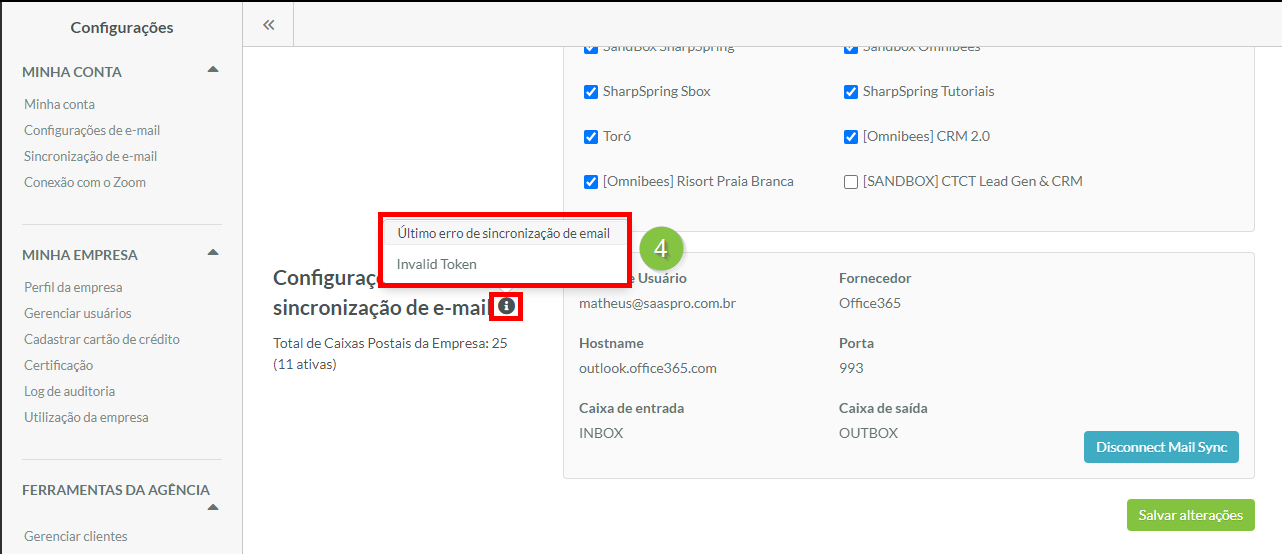 Menu do Usuário > Configurações > Sincronização de E-mail para acessar o registro de todos os erros recentes.