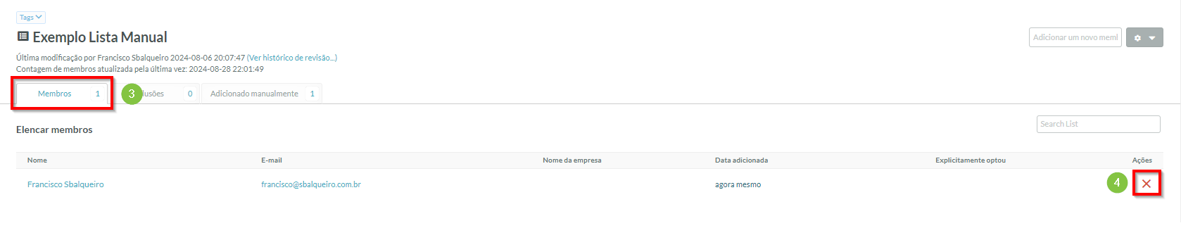 Remover à direita do nome do lead desejado. - Para a aba Adicionados Manualmente: Clique