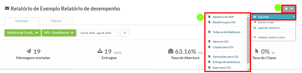 Para exportar as informações contidas no relatório geral de email como um arquivo .PDF ou .CSV, ou para exportar partes individuais do relatório como um arquivo .CSV, faça o seguinte: