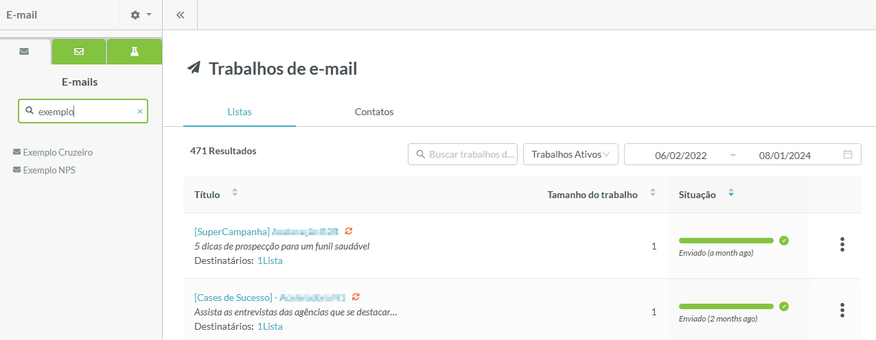 Você pode filtrar os trabalhos de email por data usando o seletor de intervalo de datas e selecionando trabalhos de email ativos ou inativos. Clicar em um trabalho levará você ao resumo do trabalho.